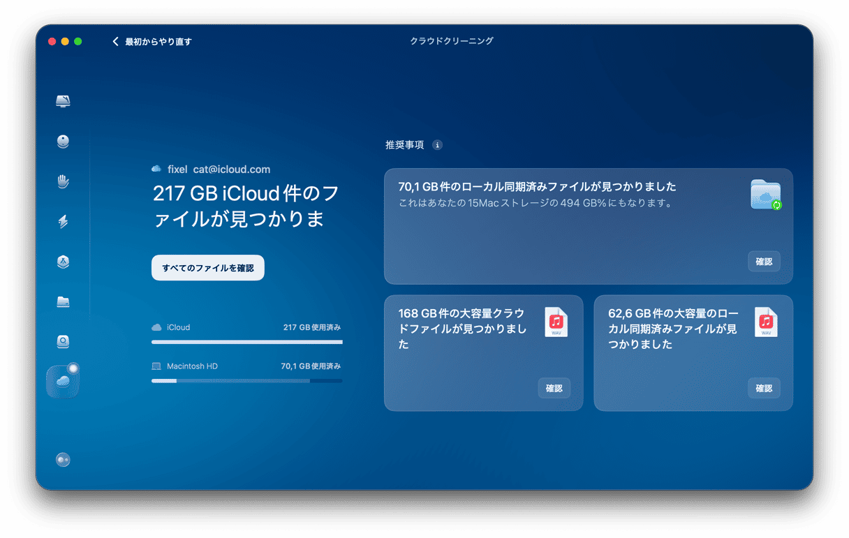 - サイドバーから「クラウドのお掃除」>「iCloudに接続」に進みます。