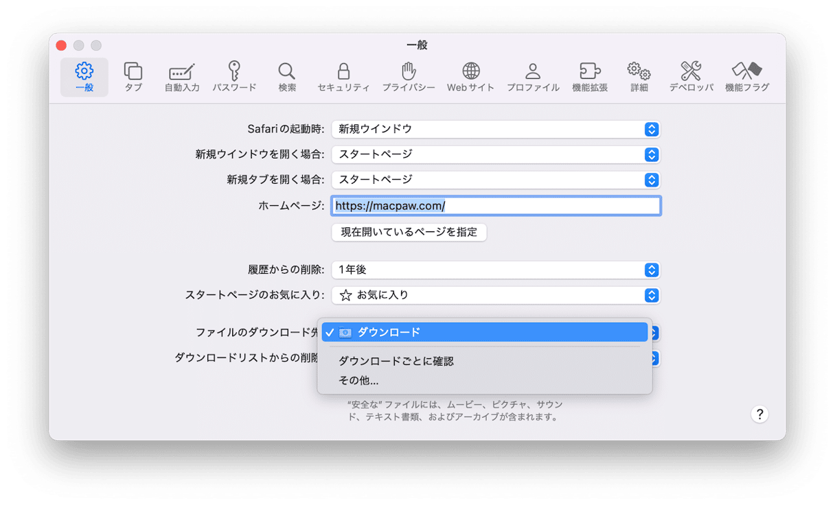 - Safari:「設定」>「一般 (ファイルのダウンロード先の欄)」