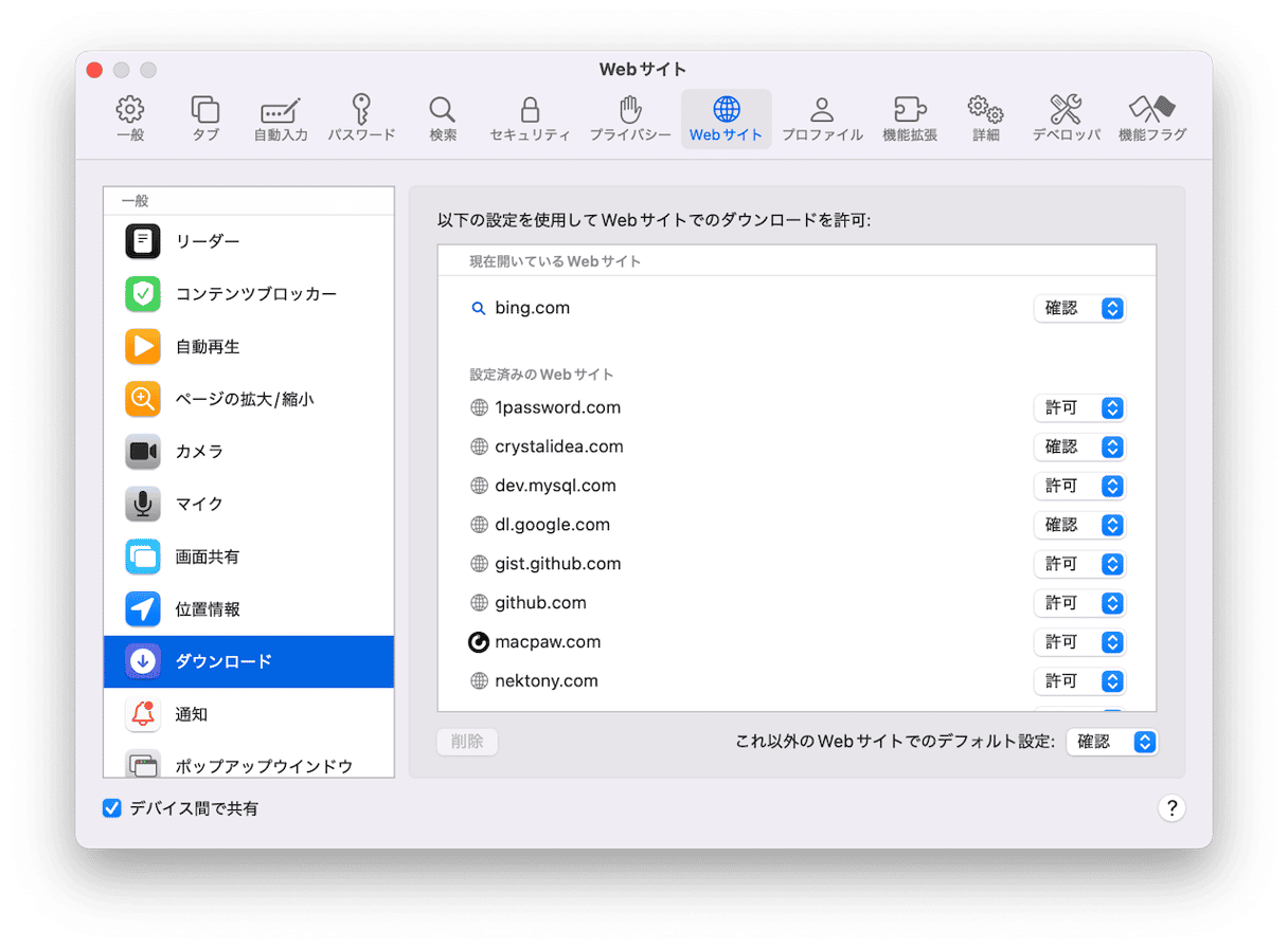- Safari:「設定」>「Webサイト」>「ダウンロード」に移動し、特定のサイトのダウンロード権限を確認します。