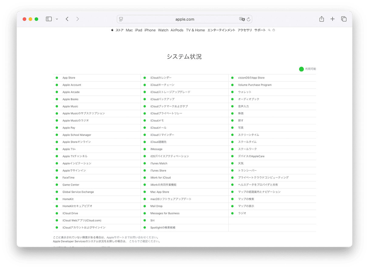 ダウンロードしようとしているファイルがApp Storeや他のAppleサービスからのものであったり、iCloudからのものである場合には、Appleのサーバーに問題がある可能性があります。 それを確認するには、ウェブブラウザでこのリンクにアクセスします。 MacのApp StoreやiCloud Driveなど、ダウンロード元のサービスを探します。 横に緑色の点がある場合は、正常に動作しています。 そうでない場合は、問題があります。 その場合にできることは、復旧するのを待つことだけです。