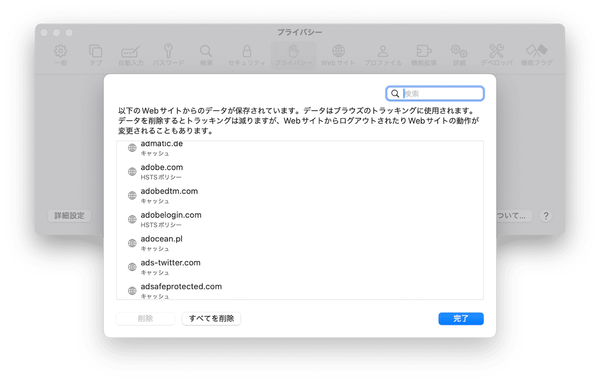 たまにブラウザのキャッシュファイルによって競合が起こり、ダウンロードが妨げられることがあります。 キャッシュの消去方法は、ブラウザによって多少異なります。 このオプションは、ブラウザ設定の「セキュリティとプライバシー」の欄から通常は確認できます。 Safariの場合は「Safari」>「設定」>「プライバシー」にあります。 次に「Webサイトデータを管理」のボタンをクリックして、データが読み込まれたら「すべてを削除」をクリックします。 Chromeの場合は、アドレスバーの右側にある3つの点をクリックして「設定」>「プライバシーとセキュリティ」>「閲覧履歴データを削除」を選択します。 Firefoxでは、アドレスバーの右側にある3本線をクリックして「設定」>「プライバシーとセキュリティ」から「Cookieとサイトデータ」まで下にスクロールして「データを消去」をクリックします。 ブラウザ拡張機能がインストールされている場合は、それらを無効にして問題が解決するかを確認してみるべきです。