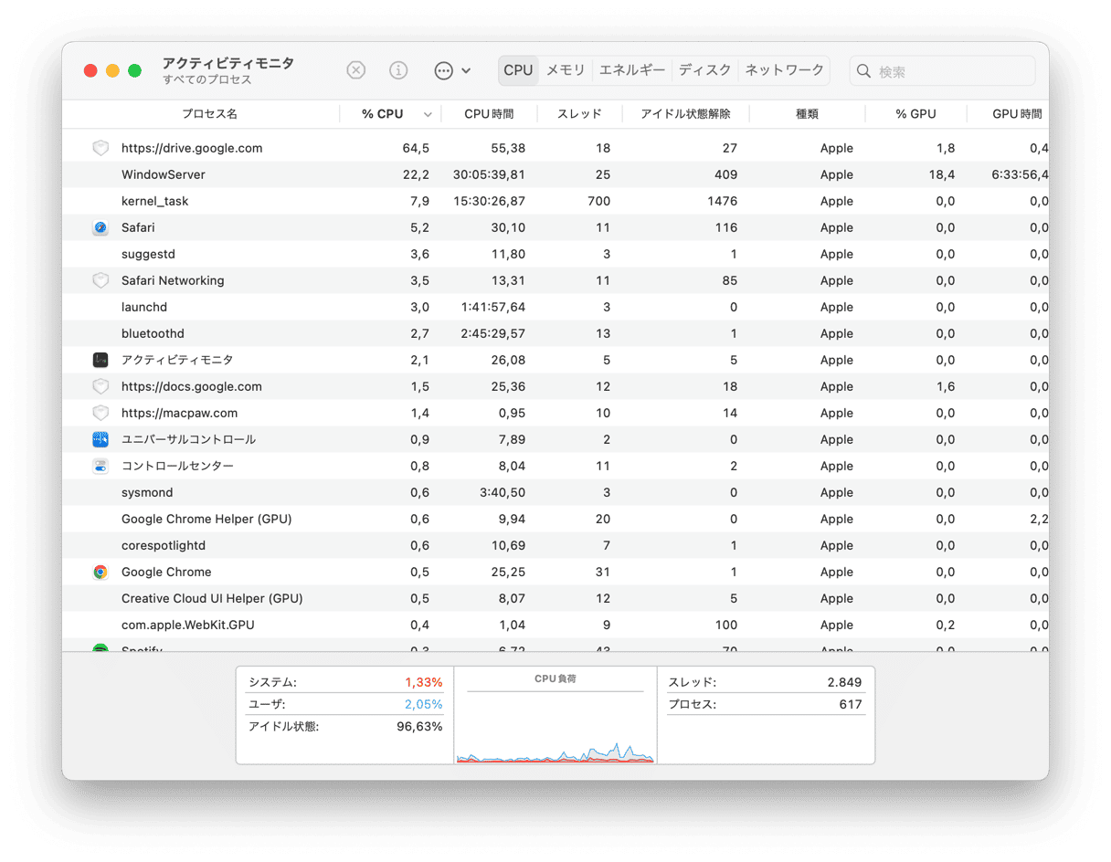 アプリケーションやプロセスがシステムの応答を停止させることがあります。 そんなとき、アクティビティモニタが役に立ちます。 消費の激しいアプリやプロセスを突き止め、CPUのディスク使用量を監視することができます。 また、マルウェアの検出にもお勧めです。