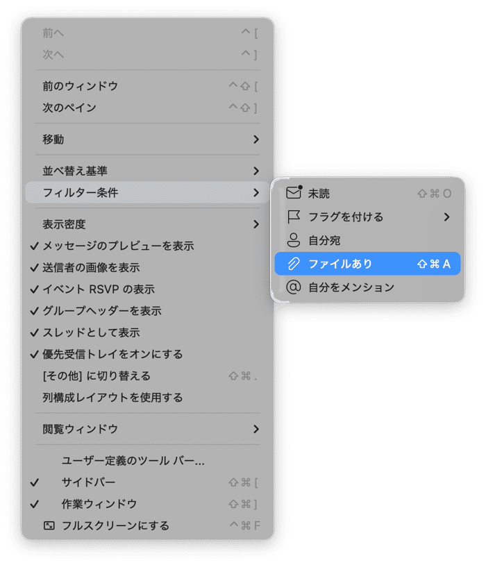 - メニューバーから「表示」>「フィルタ」>「添付ファイルあり」をクリックします。これで、受信トレイには添付ファイルのあるメッセージのみが表示されます。