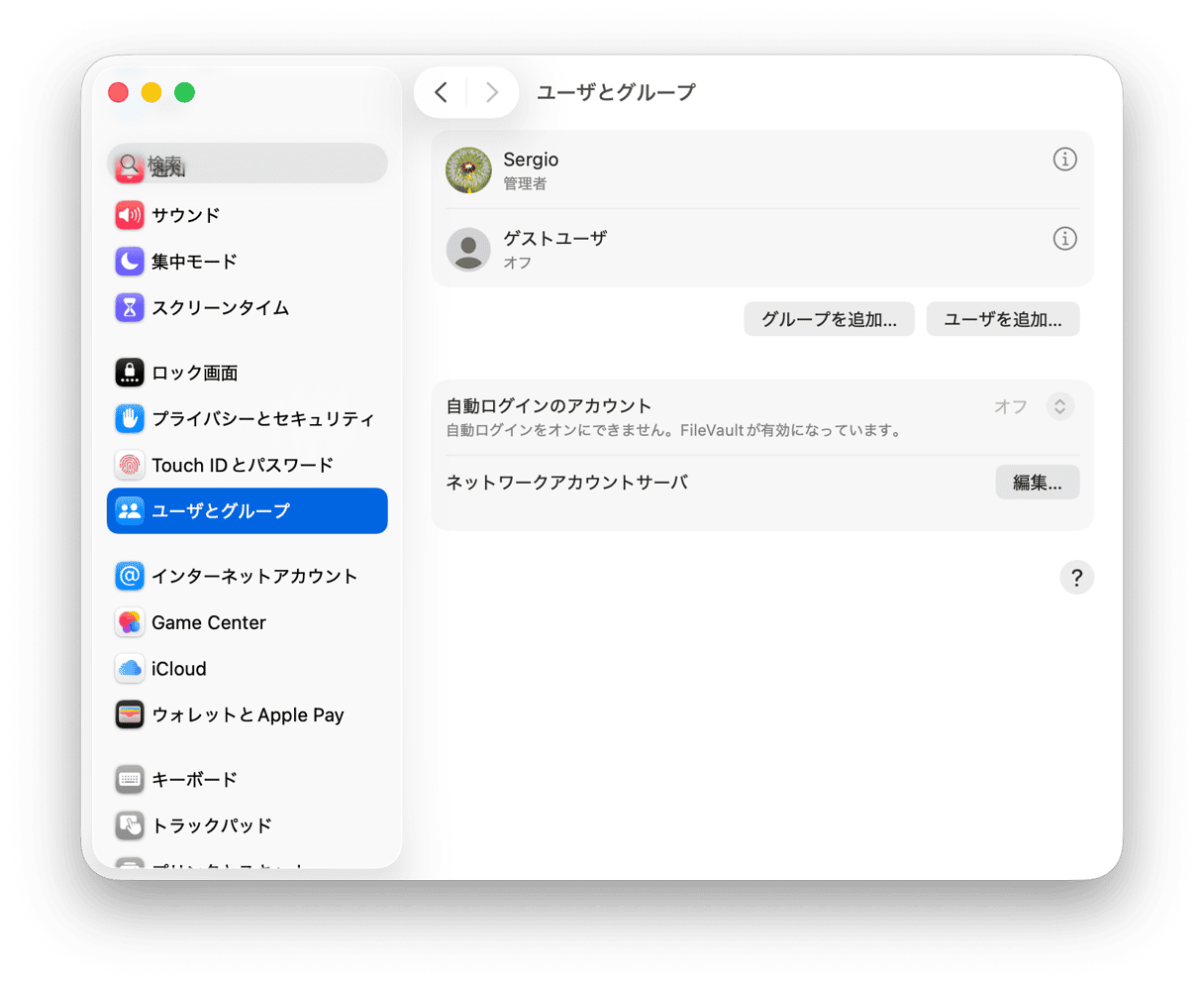 - 「システム設定」 > 「ユーザとグループ」でインストールされているプロファイルを確認します。 現在ログインしているユーザーの横にある「i」をクリックして「このユーザにこのコンピュータの管理を許可」の項目をオンにします。現在のユーザーに管理者権限がなければ、アカウントを追加する必要があるかもしれません。