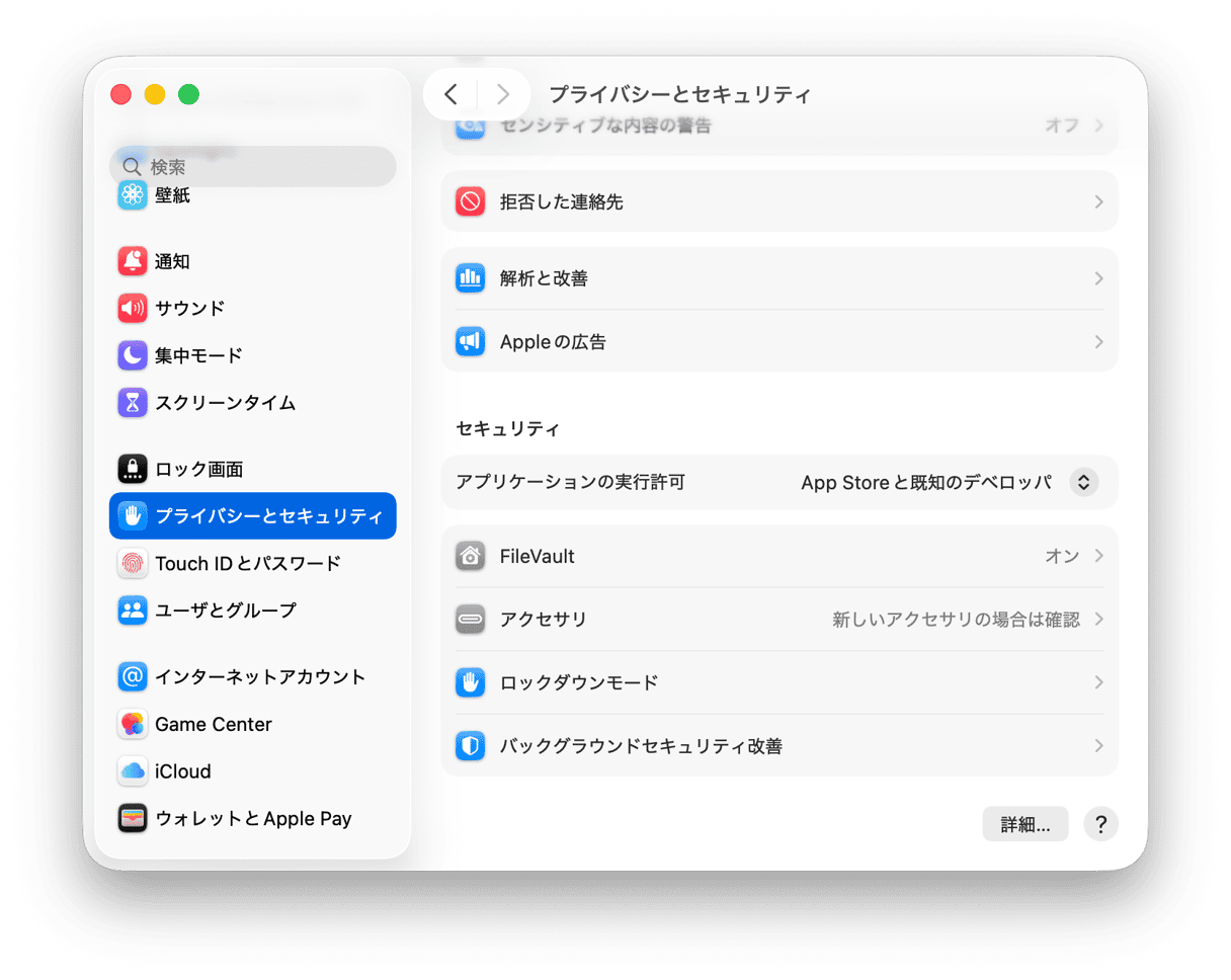 - Appleメニューから「システム設定」>「プライバシーとセキュリティ」をクリックします。