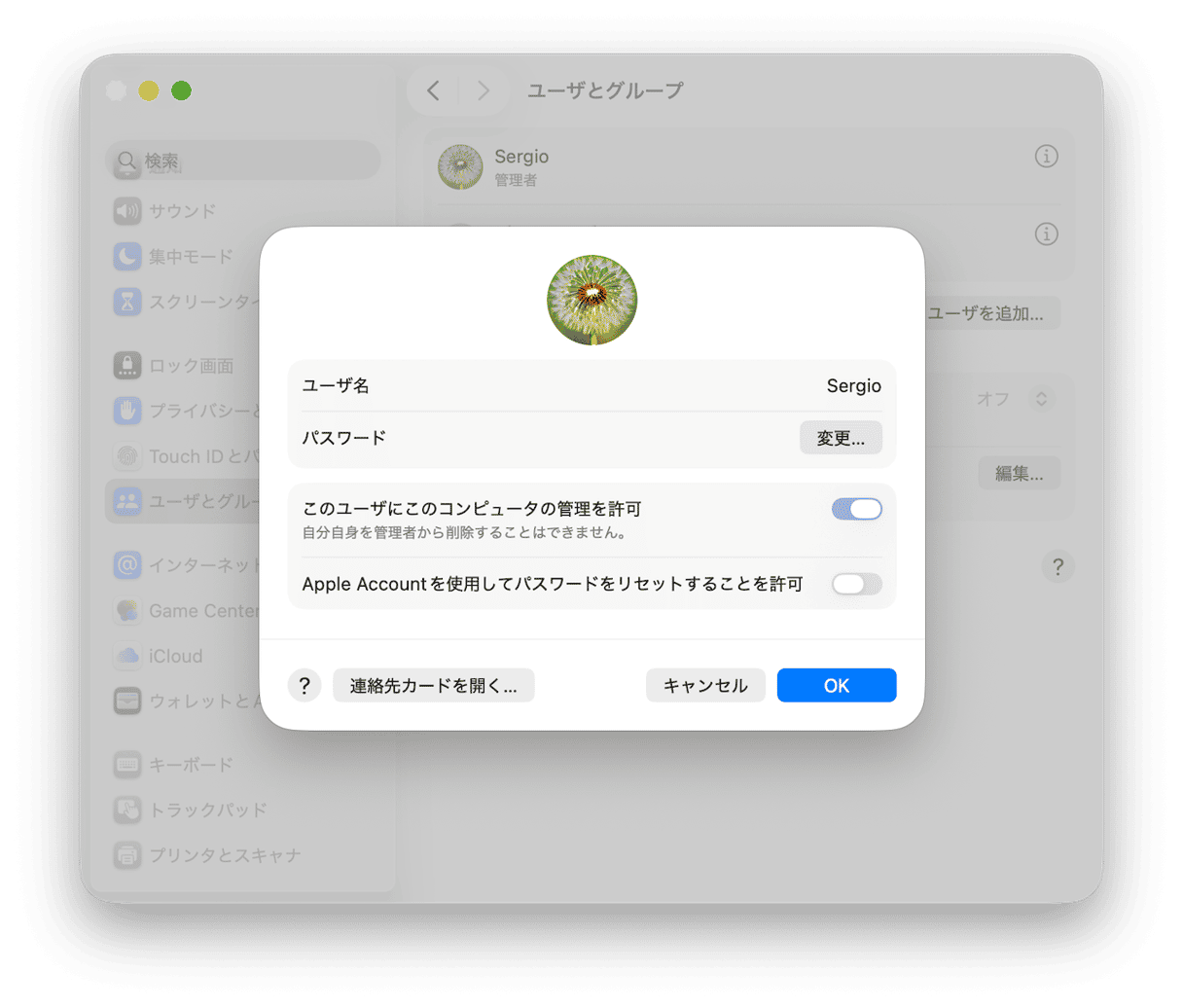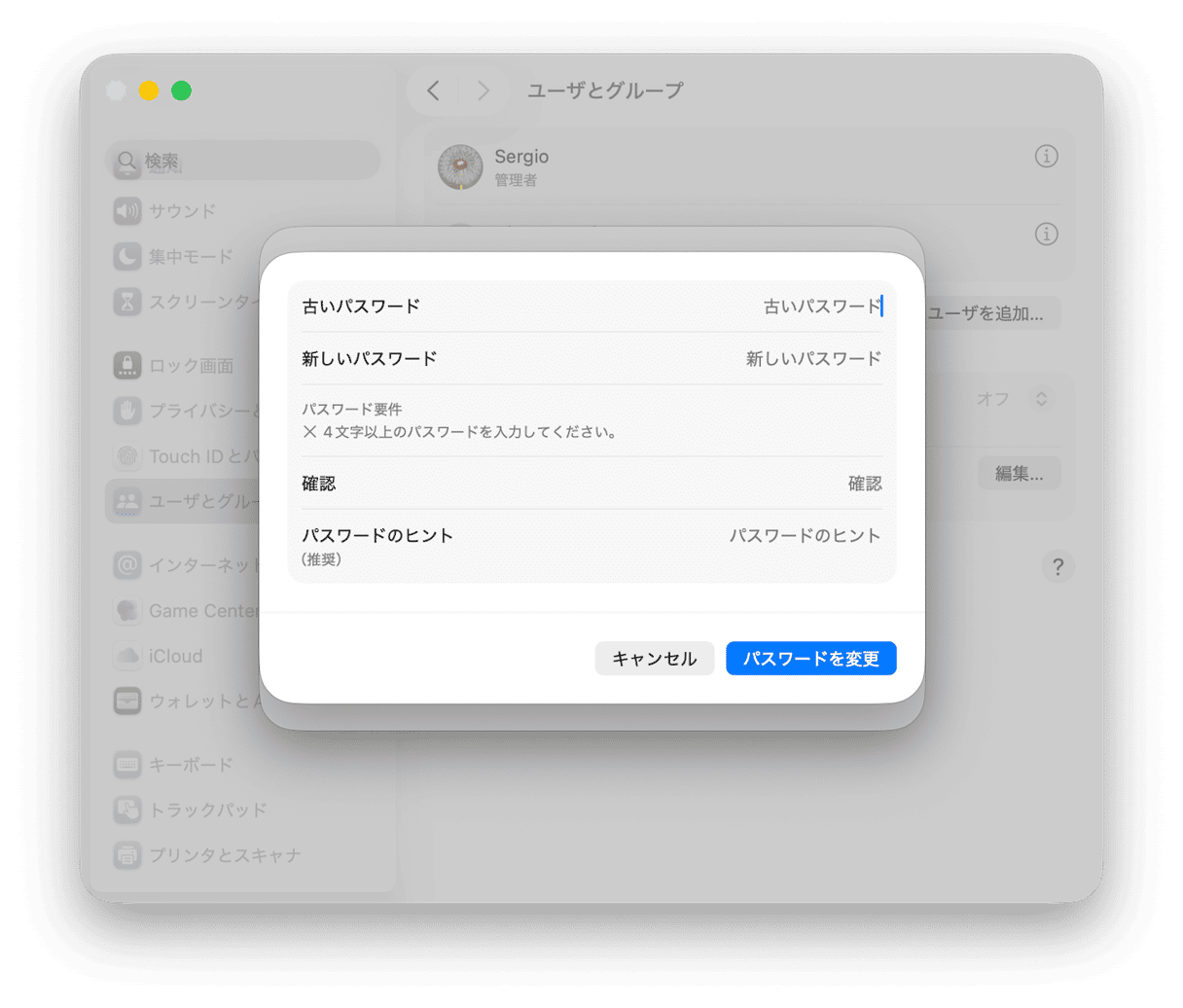 - 「システム設定」>「ユーザとグループ」を開きます。