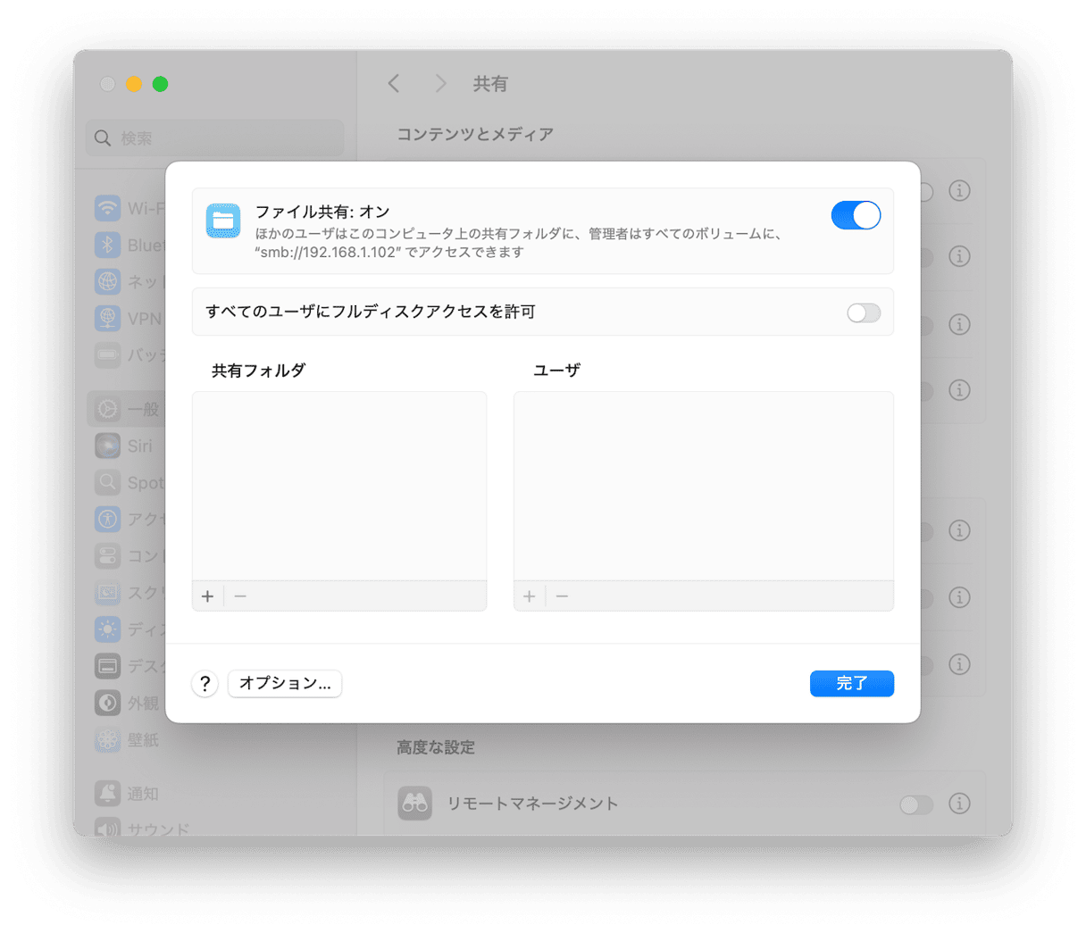 - 「ファイル共有」の横の情報ボタンをクリックしてオンにします。 Mac全体を共有したい場合は、フルディスクアクセスを許可します。