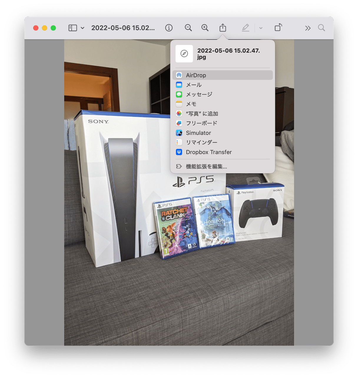 - 共有したいアイテムを開き、ツールバーのAirDropのアイコンをクリックして、受信するデバイスを選択します。