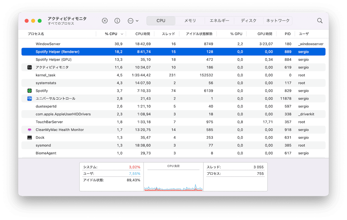 カーソルが表示される原因のひとつに、ご利用のMacが古くなっていることが考えられます。 CPUの使用率をチェックすることで、それが事実かどうかを把握することができます。 CPUの使用率を確認するには、アクティビティモニタを開きます。 アプリケーションのユーティリティのフォルダから見つけるか、Spotlight検索を実行します。