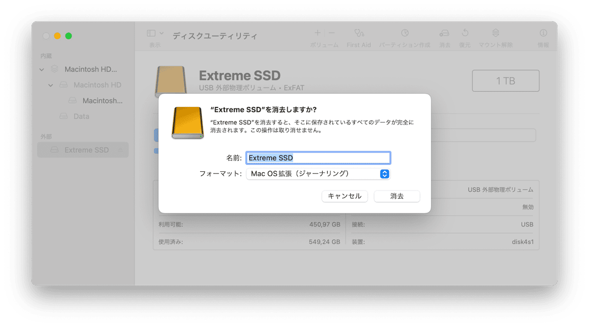 ディスクユーティリティを使用して外付けドライブをフォーマットする手順は以下のとおりです:
