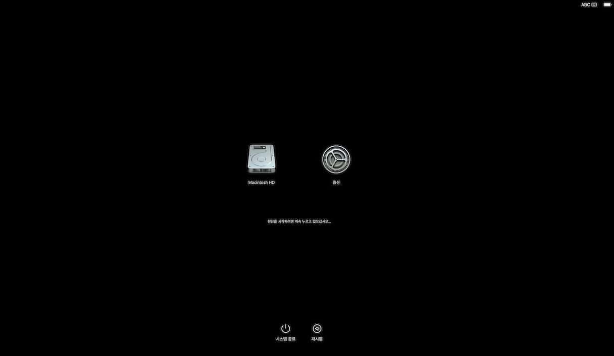 - 전원 버튼을 눌렀다 놓은 다음 Command+R을 길게 누르세요.