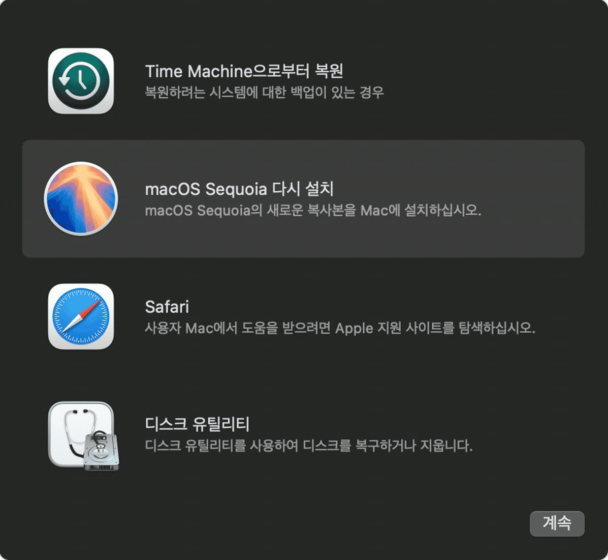 복구 모드에 들어가면 macOS 재설치를 클릭하고 화면의 지시사항을 따라하세요.