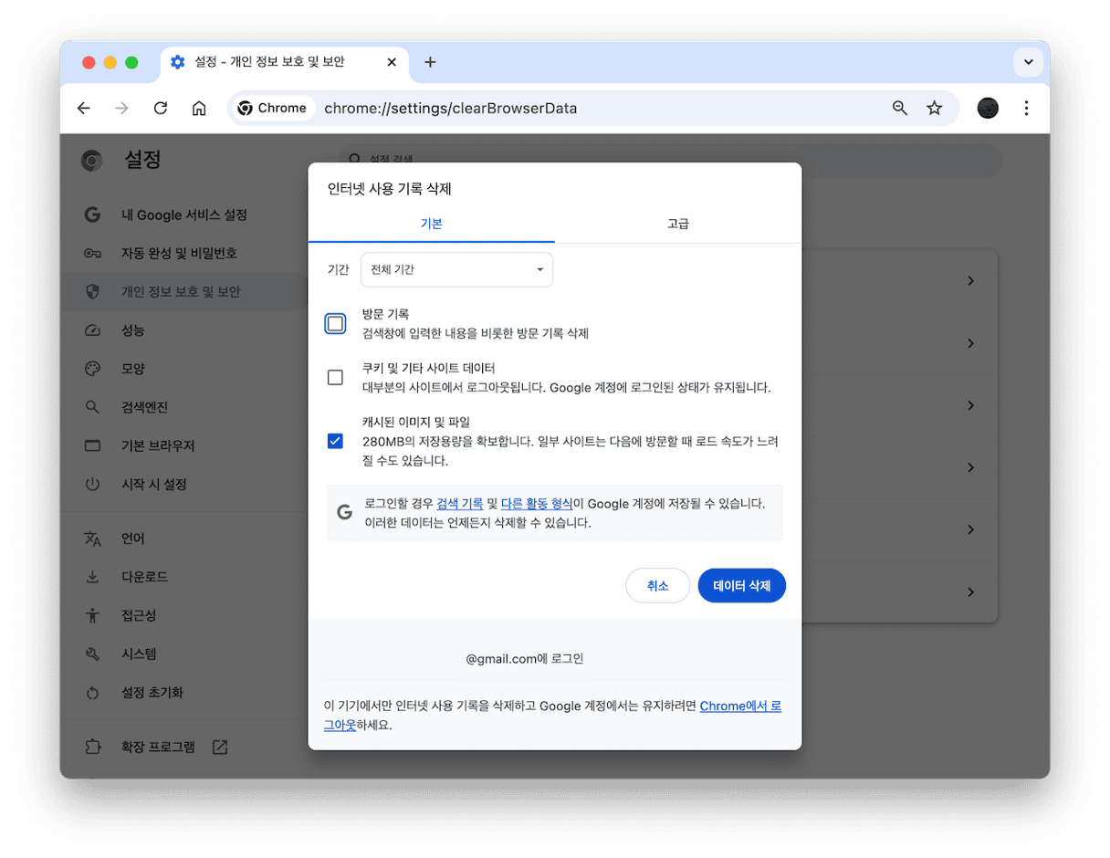 - 그리고 "캐시된 이미지 및 파일"을 선택한 뒤 데이터 삭제를 클릭합니다.