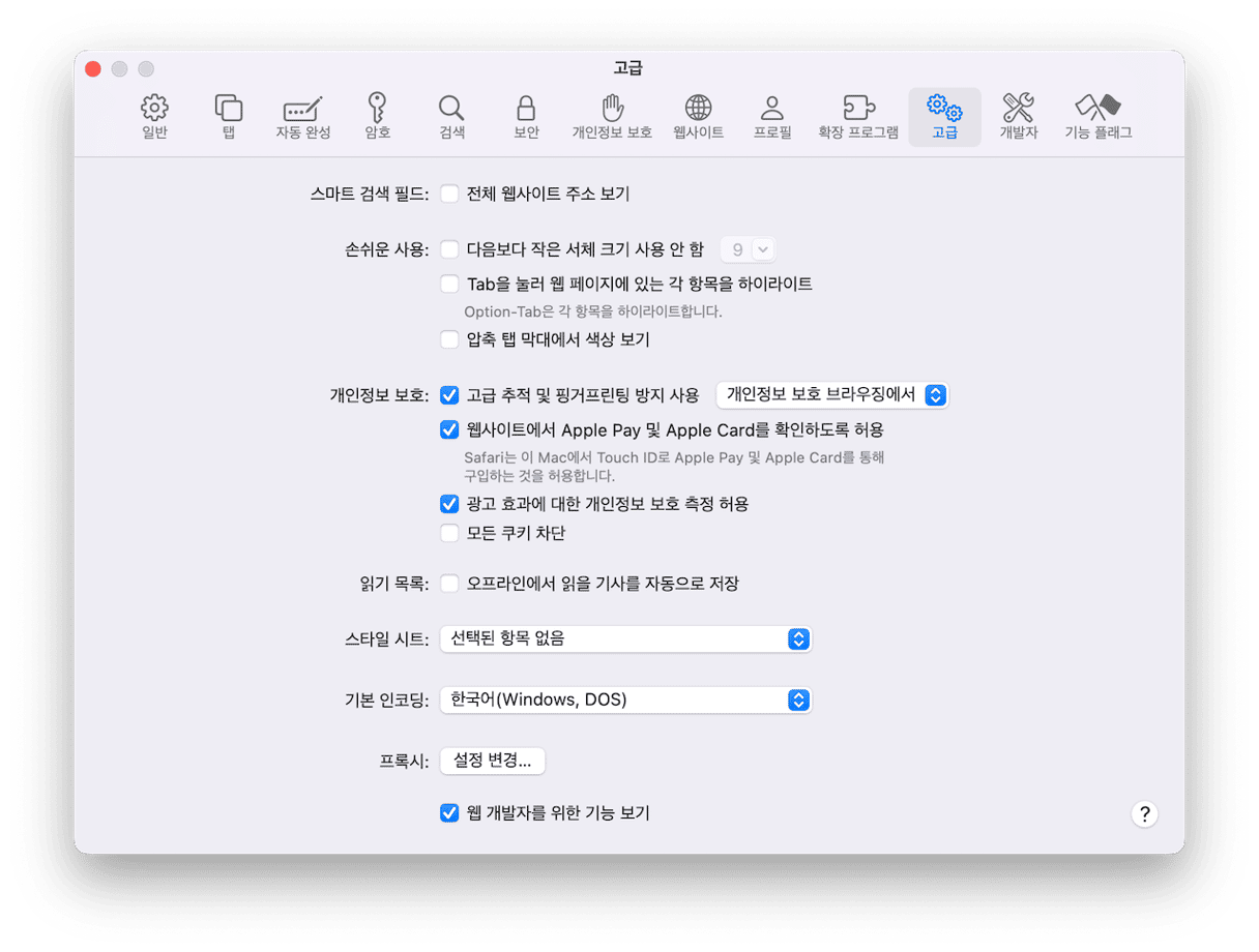 - '고급' 탭에서 '웹 개발자를 위한 기능 보기'(macOS Sequoia의 경우 '개발자를 위한 기능 보기')를 체크합니다.