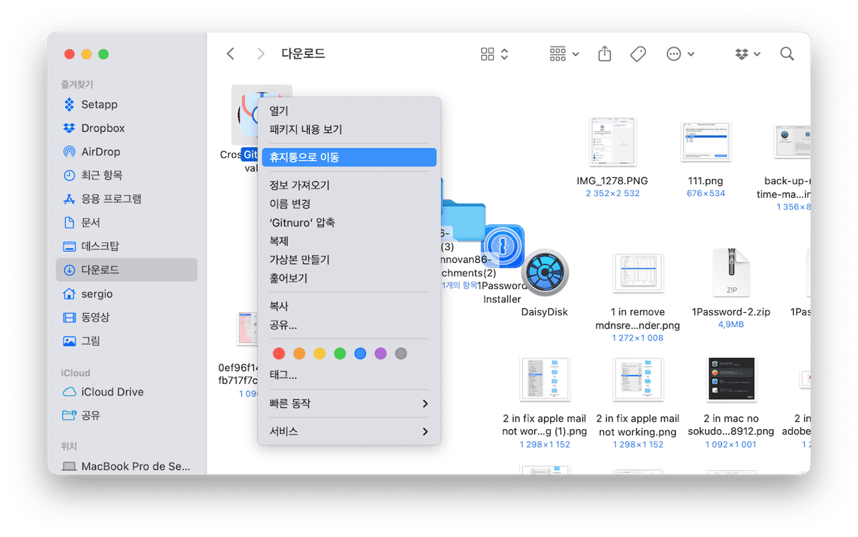 - 제거할 파일을 마우스 오른쪽 버튼으로 클릭한 뒤 휴지통으로 이동을 클릭합니다.