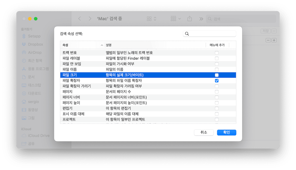 모두 완료했습니다! 이제 + 버튼을 눌러 다른 파일 확장자를 입력하고 크기별로 결과를 정렬할 수 있습니다 (위의 단계를 따라야 하는 것은 같지만 '기타…' 목록에서 파일 확장자를 선택해야 합니다). .DMG 파일 또는 앱 설치 프로그램부터 시작하실 것을 추천합니다. 단지 공간만 차지할 뿐 이러한 파일이 없어도 사는데 지장 없습니다. ZIP 압축파일도 마찬가지입니다.
