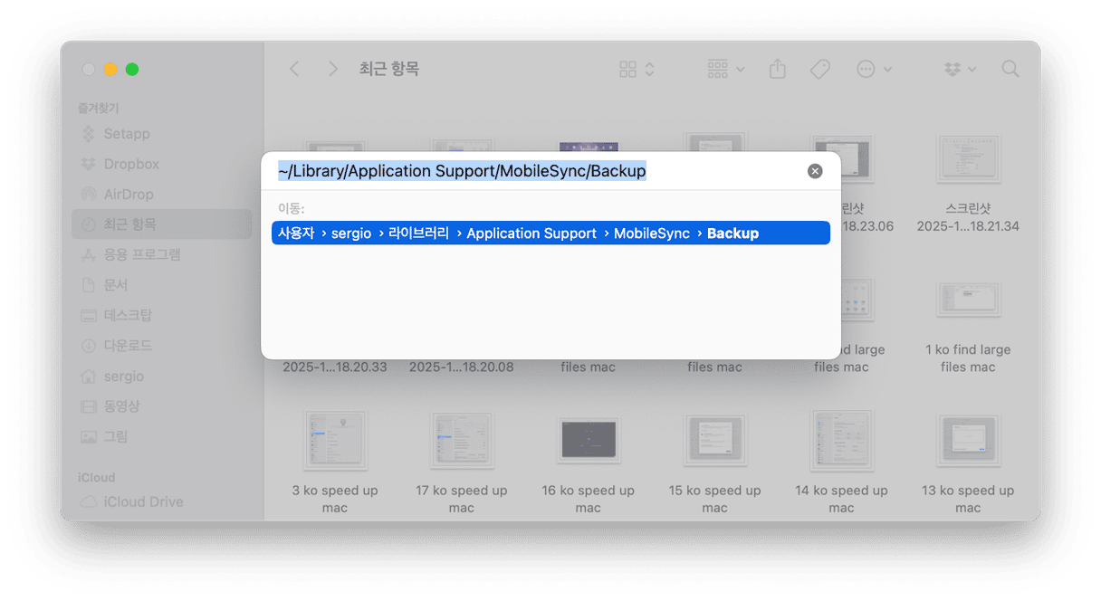 ~/Library/Application Support/MobileSync/Backup경로를 붙여넣은 후 엔터 키를 누릅니다.- 폴더 내용물을 휴지통으로 이동하기만 하면 끝입니다.