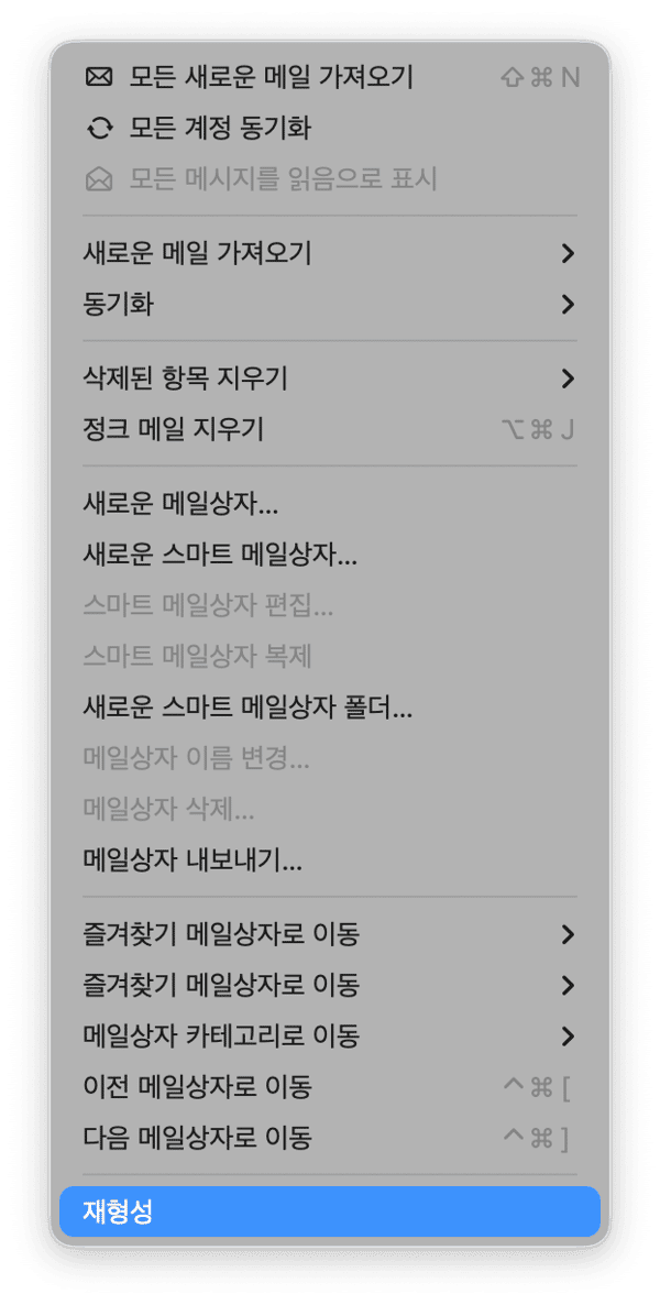 Mail에서 사이드바의 통합 받은편지함을 선택하세요. 그다음 우편함 메뉴를 클릭하고 재구축을 선택하세요. 이렇게 하면 메일 메시지의 인덱스가 다시 생성되어 검색 문제를 해결할 수 있어요.