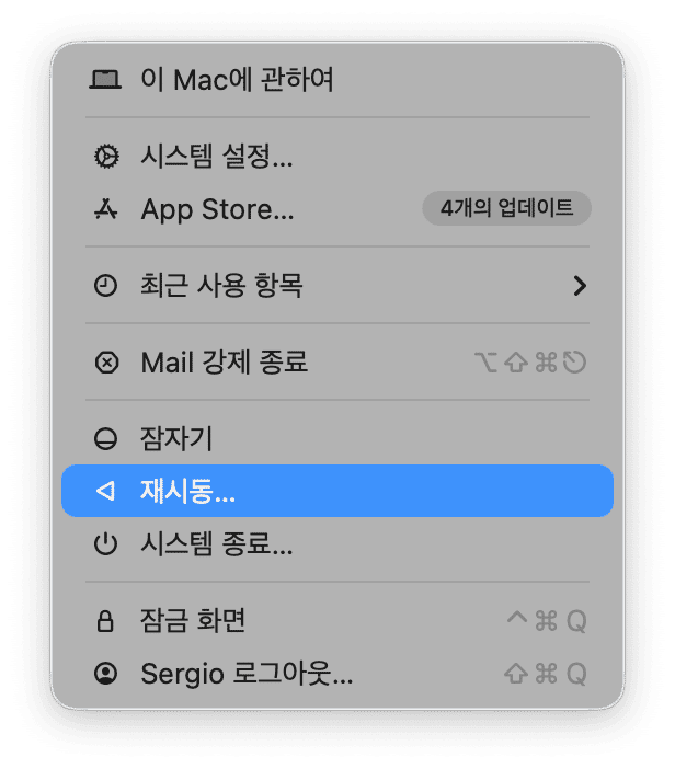 Mail을 재시작해도 안 되면 맥을 재부팅해 보세요. 이렇게 하면 RAM이 정리되고, 시스템 전체의 임시 파일이 삭제되고 Apple Silicon 맥에서는 시동 디스크 검사도 실행돼요.
