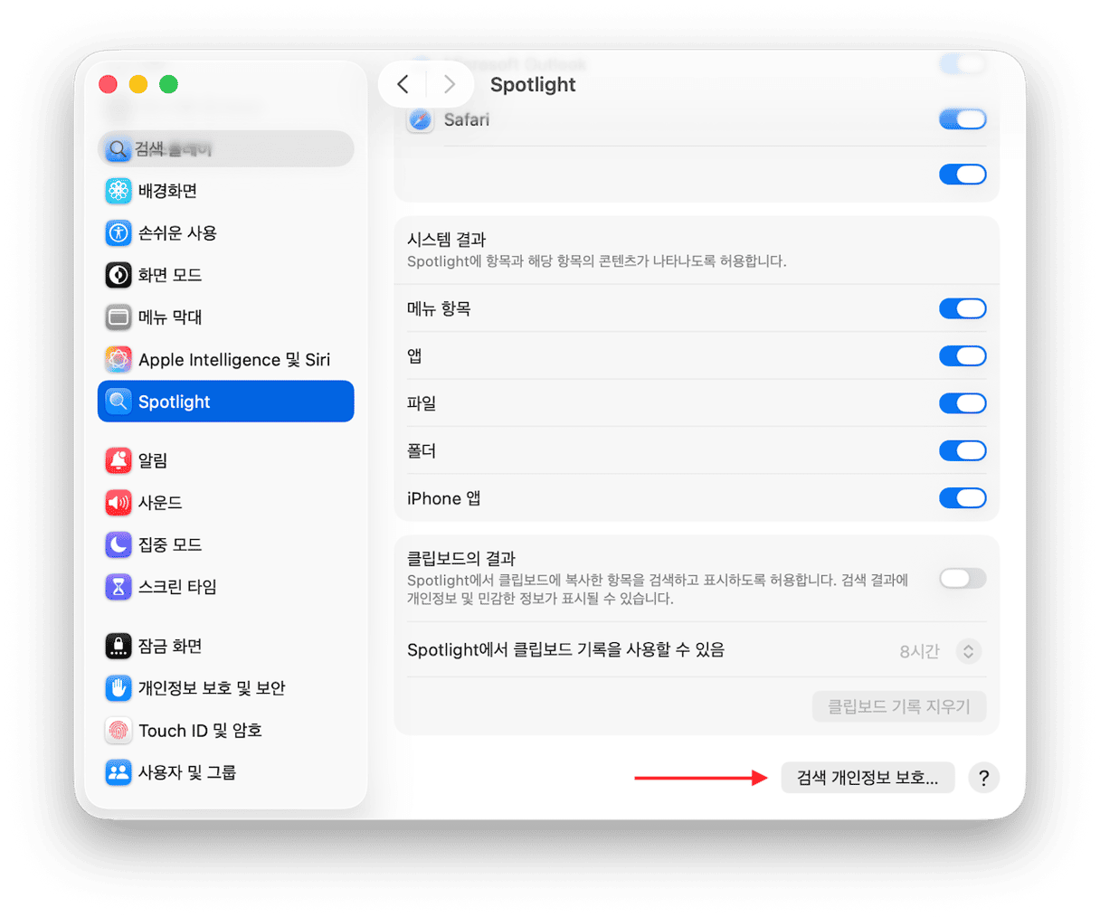 - Spotlight로 이동하여 창 하단으로 스크롤하고 검색 개인정보 보호를 클릭하세요.