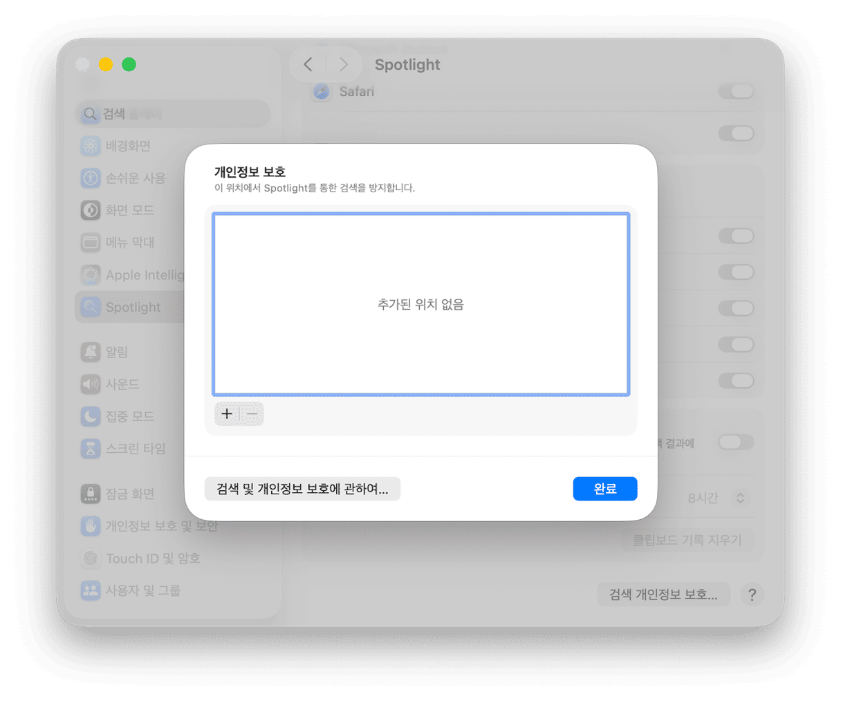 - 몇 초 기다린 후 시스템 설정을 다시 여세요. Spotlight > 검색 개인정보 보호로 이동하세요.