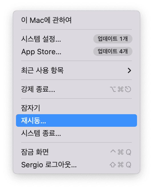 Mac을 재시동하면 임시 파일이 지워집니다. 최신 Mac에서는 시동 디스크에 대한 검사를 수행하기도 하죠. 원인을 파악하기 어려울 때 시도해 볼만한 좋은 방법이며, 실제로 효과를 보이는 경우도 많습니다.