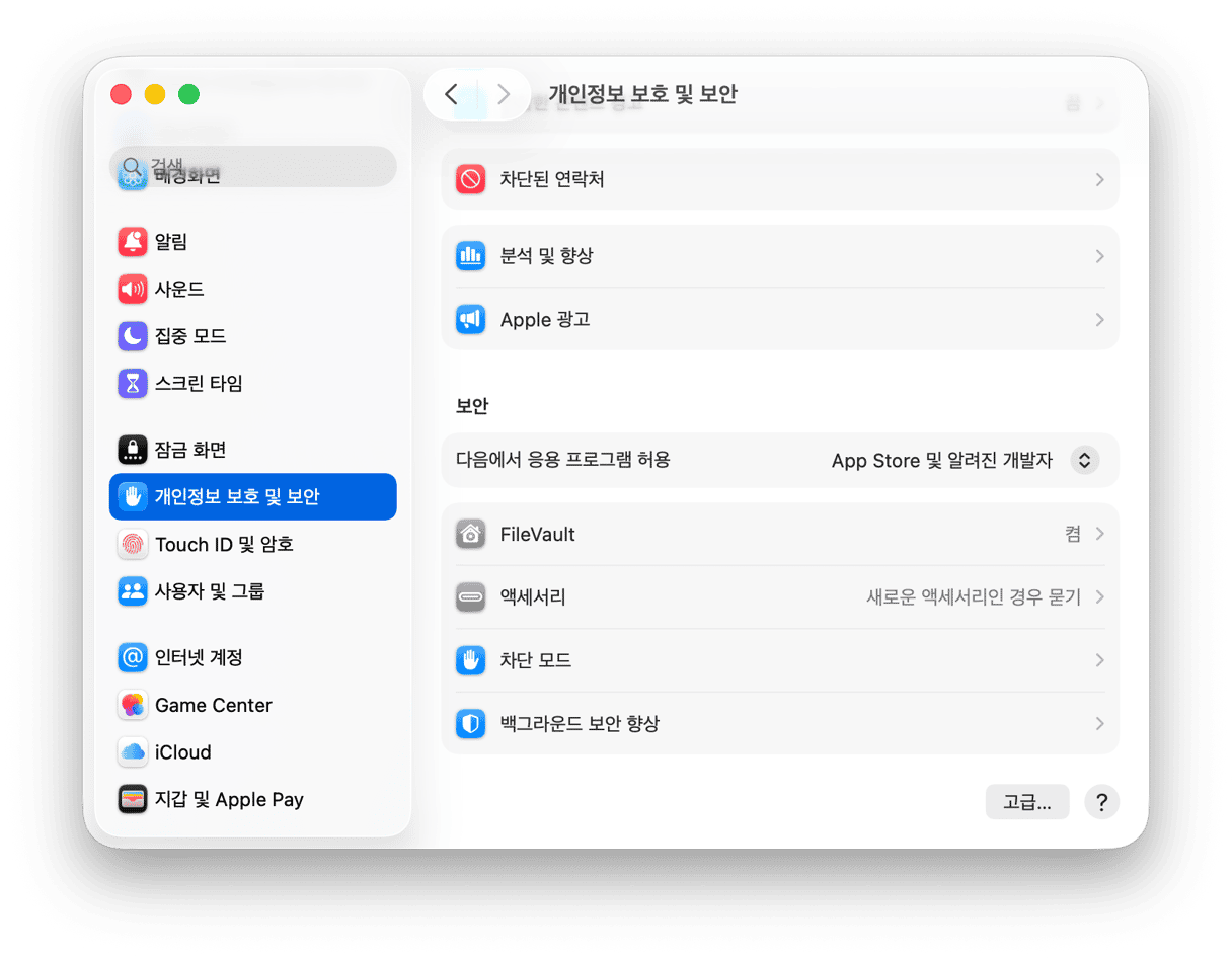 개발자 웹사이트에서 앱을 다운로드하려고 하는 경우 보안 설정에 의해 다운로드가 차단되는 경우가 있습니다. 이를 확인하려면 Apple 메뉴를 클릭하고 시스템 설정 > 개인정보 보호 및 보안을 선택합니다. 보안 섹션 아래에 'App Store 및 확인된 개발자'가 선택되어 있는지 확인하세요.
