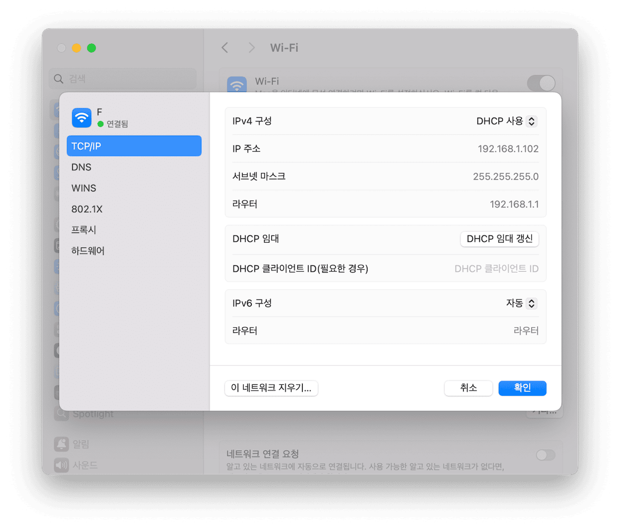 - Wi-Fi 네트워크 옆에 있는 세부사항을 클릭하고 TCP/IP로 가세요.