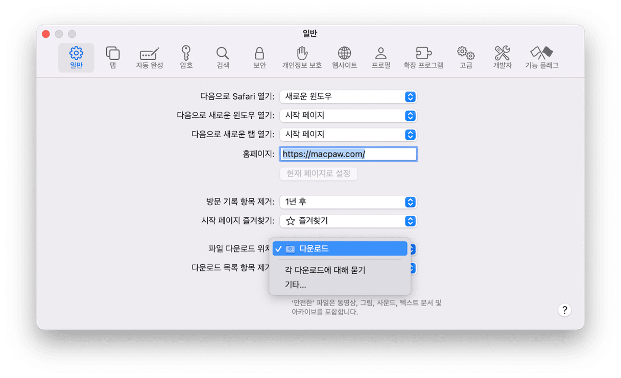 - 사파리: 설정 > 일반 (파일 다운로드 위치 옆에)