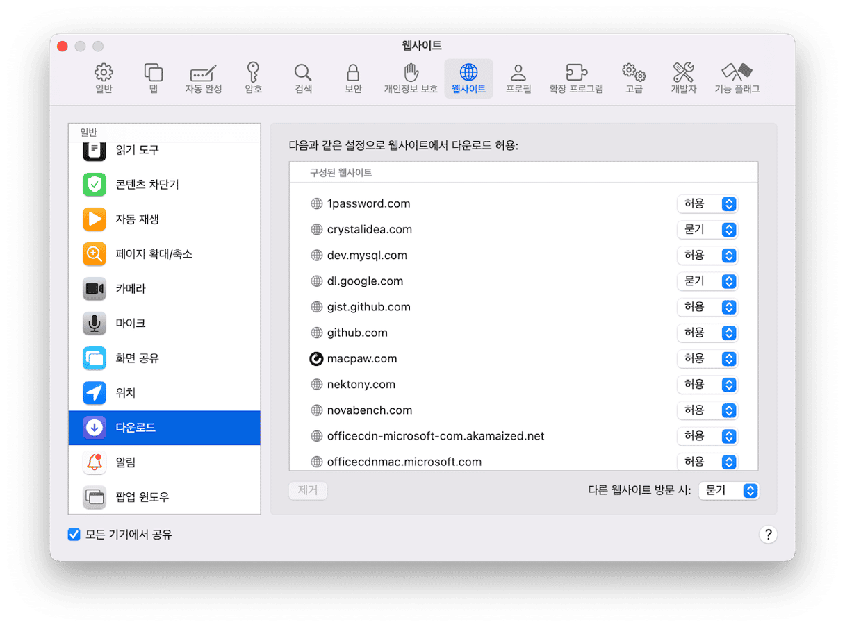 - 사파리: 설정 > 웹사이트 > 다운로드로 가서 어떤 웹사이트에 권한이 있는지 확인