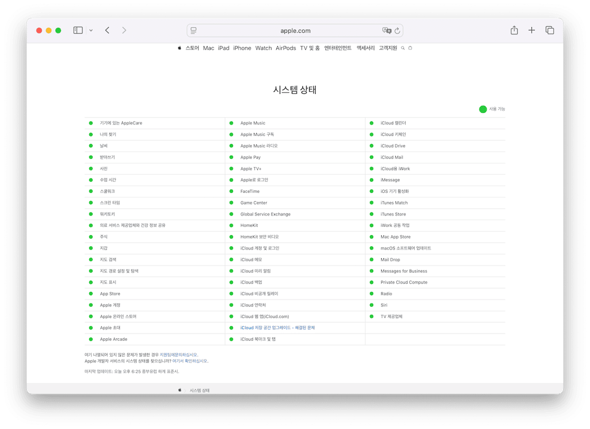 App Store 또는 다른 Apple 서비스에서 파일을 다운로드하려고 하거나 iCloud에서 가져오려는 것이라면 Apple 서버에 문제가 있는 것일 수 있습니다. 서버 상태를 확인하려면 웹 브라우저를 통해 이 링크를 방문해 보세요. 여기서 Mac App Store 또는 iCloud Drive 등 파일을 다운로드하려는 서비스를 찾습니다. 해당 항목 옆에 녹색 점이 있으면 서버가 정상적으로 작동하는 상태입니다. 그렇지 않으면 문제가 있다는 의미입니다. 이럴 때는 문제가 해결될 때까지 기다리는 것 외에 뾰족한 수가 없습니다.