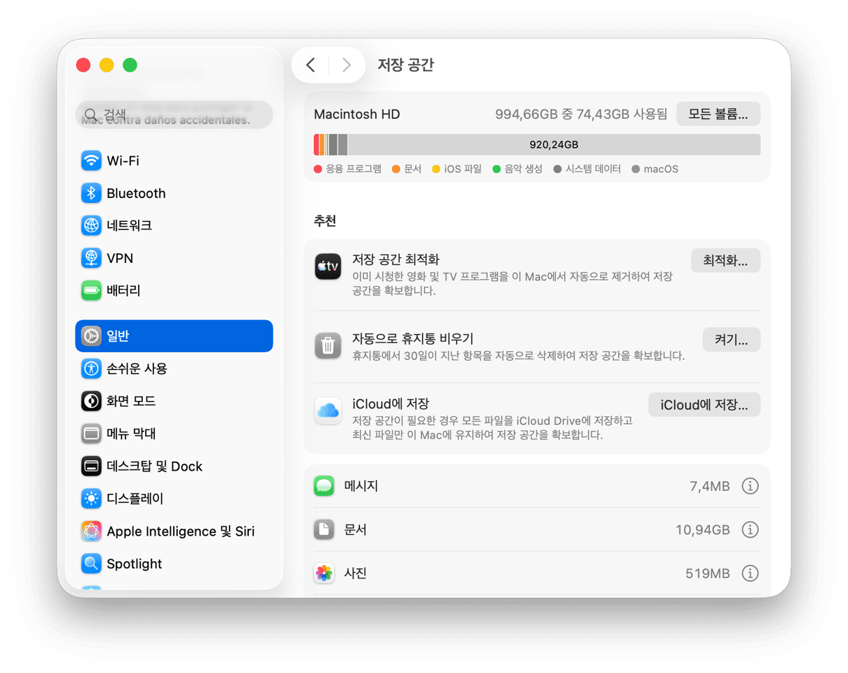 - Apple 메뉴 > 시스템 설정 > 일반 > 저장공간으로 이동하세요.