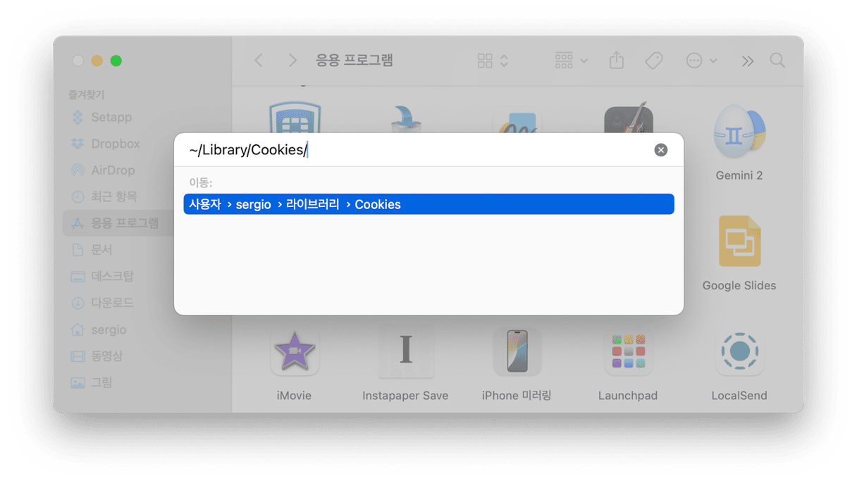 ~/Library/Cookies/~/Library/Preferences/~/Library/Containers/~/Library/Group Containers/~/Library/Application Scripts/ - 하나의 경로를 입력할 때마다 엔터 키를 눌러줍니다.