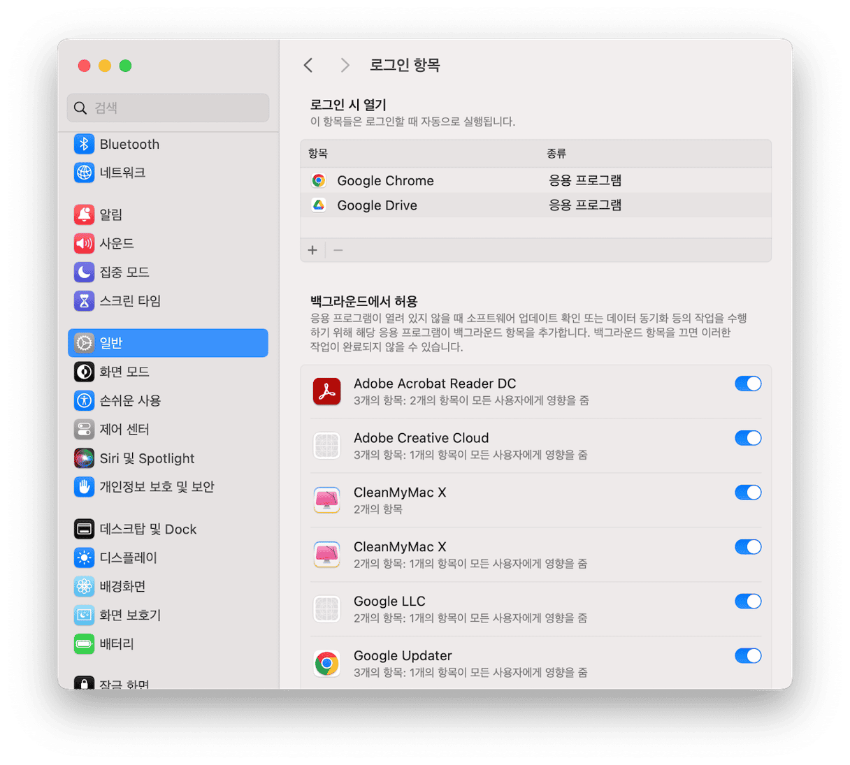 - 로그인 항목에 엉뚱한 것이 있으면 '-' 버튼을 클릭하여 삭제하세요.