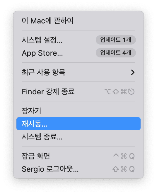 먼저 Mac을 다시 시작해보세요. 이 간단한 방법으로 얼마나 많은 문제를 해결할 수 있는지 알면 놀라실 겁니다. Apple 메뉴로 이동하여 '재시동'을 클릭하세요.