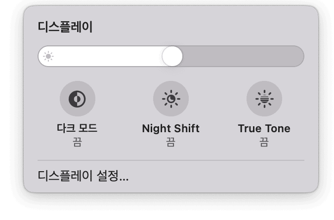 또는 메뉴 막대의 '제어 센터' 아이콘을 클릭한 후 '디스플레이'에서 'True Tone'을 꺼보시기 바랍니다. 이후 효과가 있는지 확인합니다.