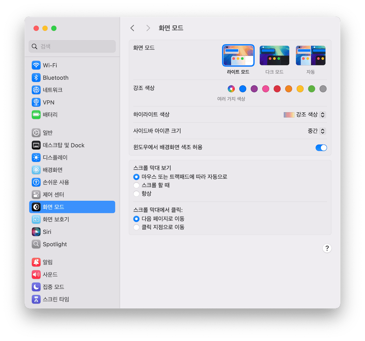 - 화면 모드 옆에 있는 '라이트 모드'를 선택합니다.