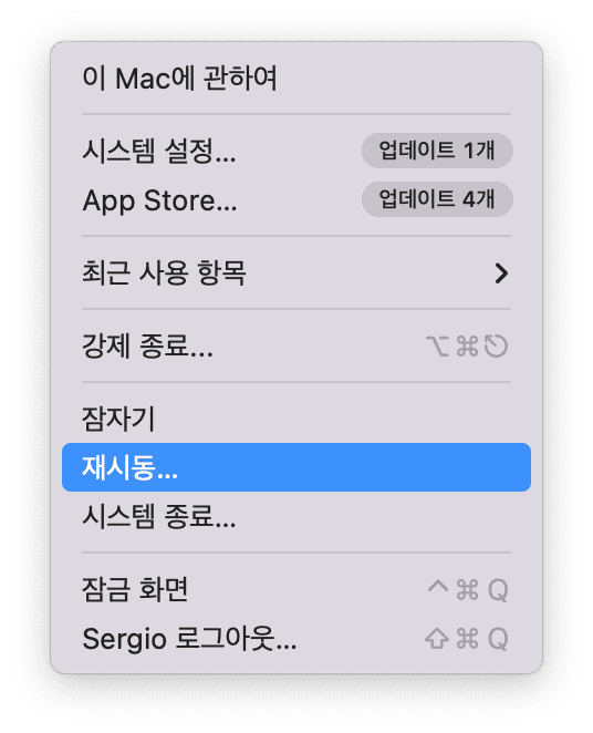Mac을 재시동하려면 Apple 메뉴에서 "재시동"을 선택하면 됩니다.