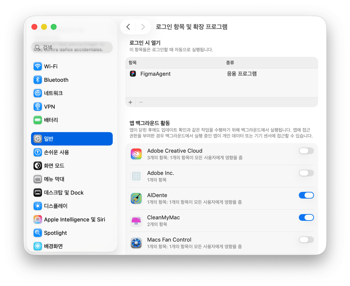 맥을 느리게 만들 수 있는 보이지 않는 앱들인 실행 에이전트도 있어요. 예를 들어, 인터넷 다운로드 속도가 갑자기 떨어졌다고 생각해 보세요. 맥에서 다운로드 속도를 높이려면 어떻게 해야 할까요? 인터넷 속도를 저하시키는 백그라운드 에이전트들을 지우면 됩니다. 이것들도 로그인 항목 및 확장 창에서 비활성화할 수 있어요. 백그라운드에서 허용된 앱들을 하나씩 살펴보기만 하면 돼요.