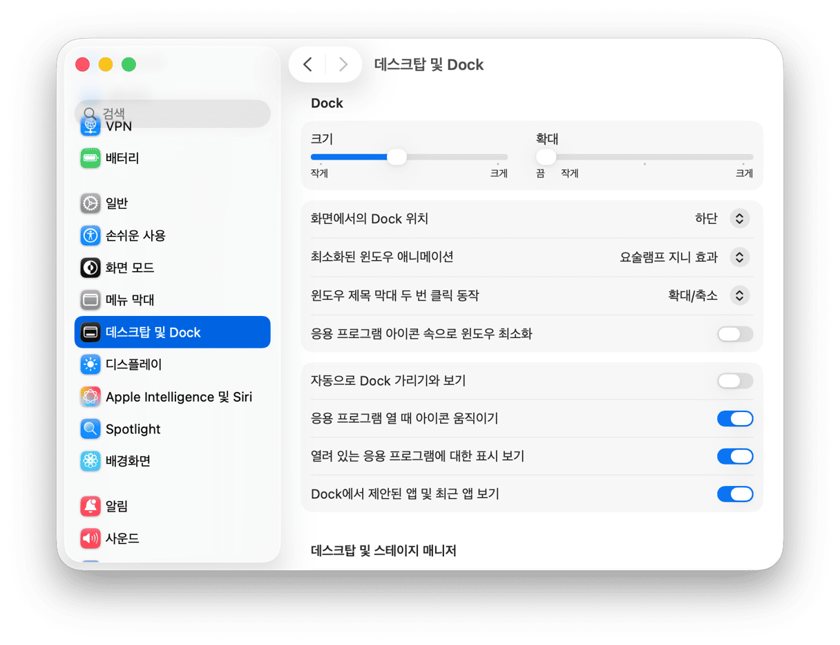- 시스템 환경설정에서 '데스크탑 및 독'을 선택합니다.