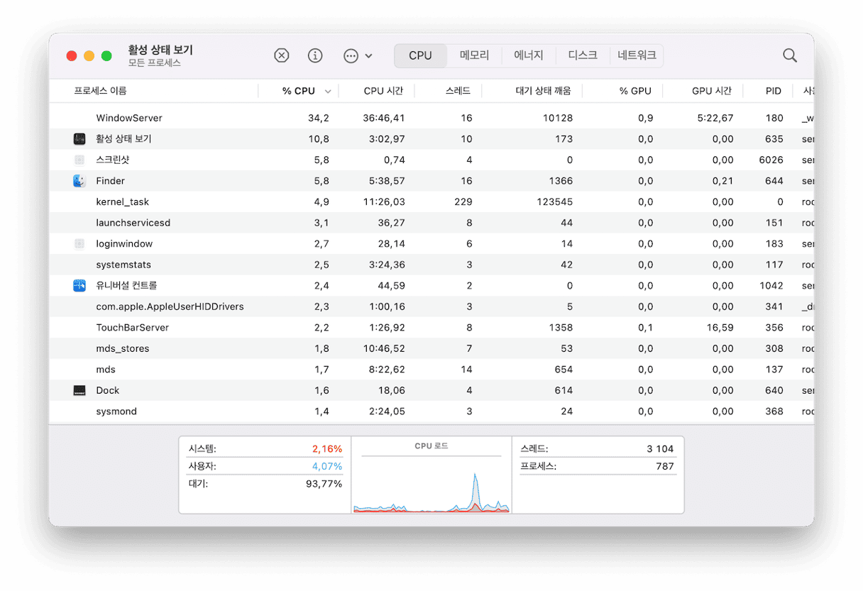 활성 상태 보기는 CPU, 메모리, 에너지, 디스크, 네트워크 등 다섯 가지 주요 리소스에 대한 자세한 정보를 제공합니다.