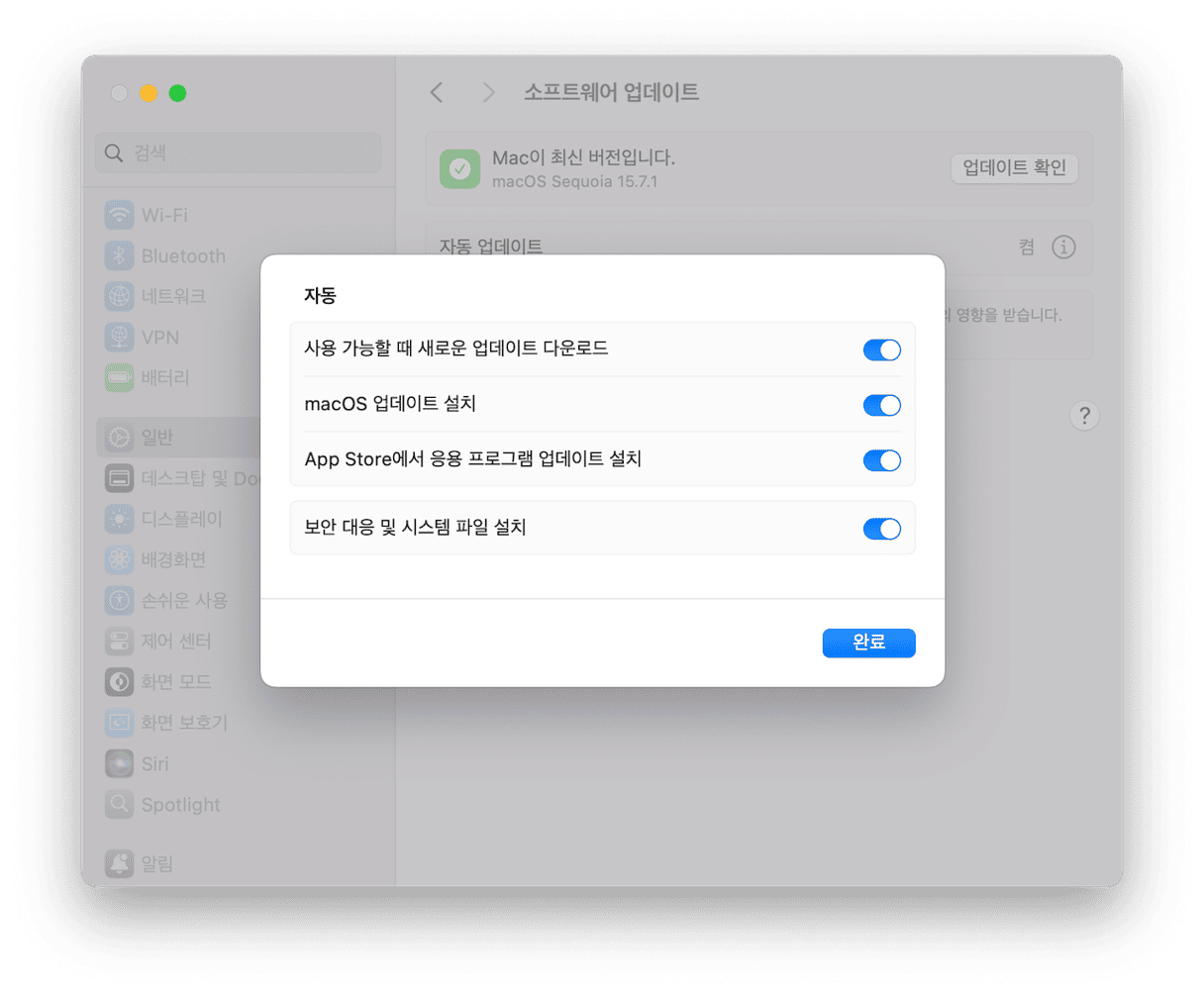 - 모든 옵션을 켜두면 앞으로는 macOS 업데이트와 앱스토어 앱 업데이트가 자동으로 설치됩니다.