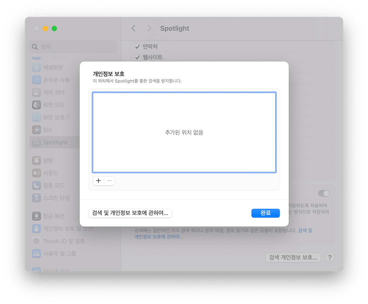 Mac OS를 최근에 업데이트하신 후라면, Spotlight 인덱싱으로 인해 시스템의 속도가 느려질 수 있습니다. 대개는 이 작업이 몇 시간 내에 완료되어 Mac이 정상적인 성능을 발휘하기 시작합니다. 그러나, 인덱싱이 지연되어 맥북속도가 저하될 경우, 속도 개선을 위해 수동 개입이 필요할 때도 있습니다. Spotlight 관련 문제를 해결하려면 시스템 설정 > Spotlight로 가서 창 하단의 '검색 개인 정보 보호'를 클릭해 인덱싱을 다시 해주면 됩니다.