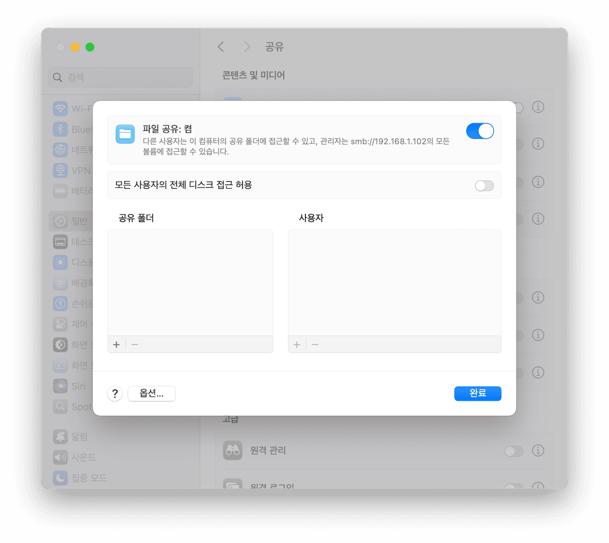- '파일 공유' 옆의 '정보' 버튼을 클릭하고 켜세요. 맥 전체를 공유하고 싶다면, 전체 디스크 접근을 허용하세요.