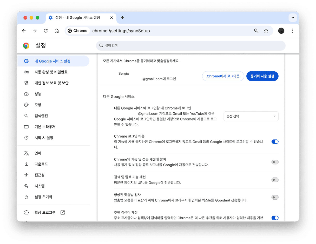 chrome://settings/로 가세요.- '동기화 및 Google 서비스'를 클릭하세요.