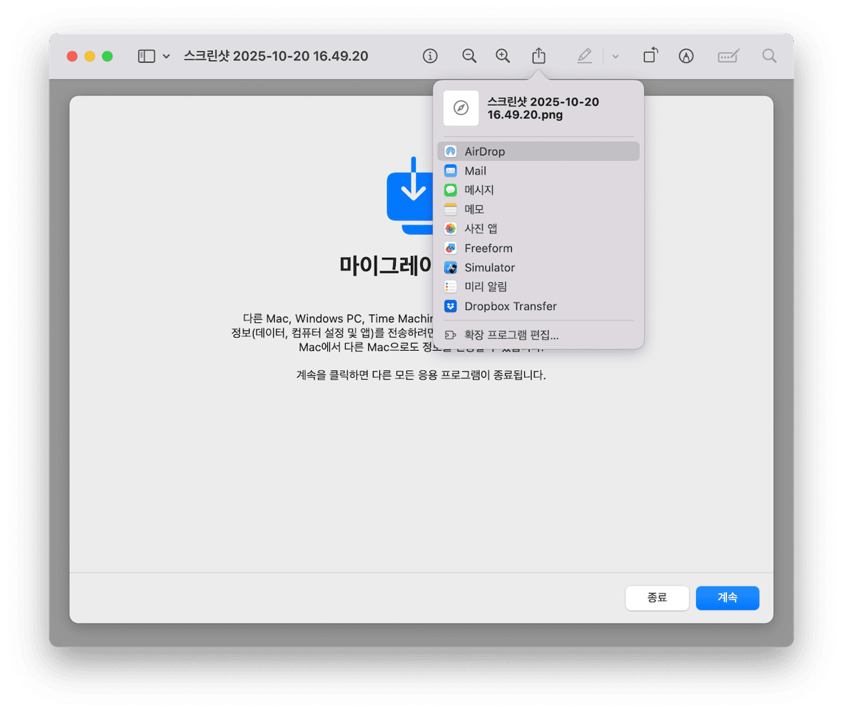 - 다른 맥으로 정보를 전송하는 옵션을 선택하세요.