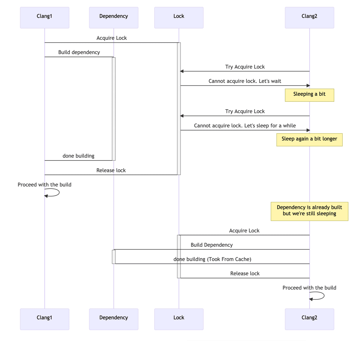 Clang1DependencyLockClang2Sleeping a bitSleep again a bit longerDependency is already builtbut we're still sleepingAcquire LockBuild dependencyTry Acquire LockCannot acquire lock. Let's waitTry Acquire LockCannot acquire lock. Let's sleep for a whiledone buildingRelease lockProceed with the buildAcquire LockBuild Dependencydone building (Took From Cache)Release lockProceed with the buildClang1DependencyLockClang2