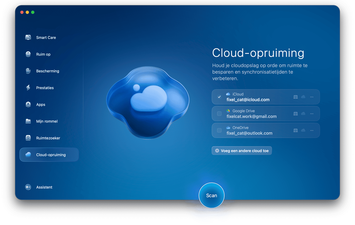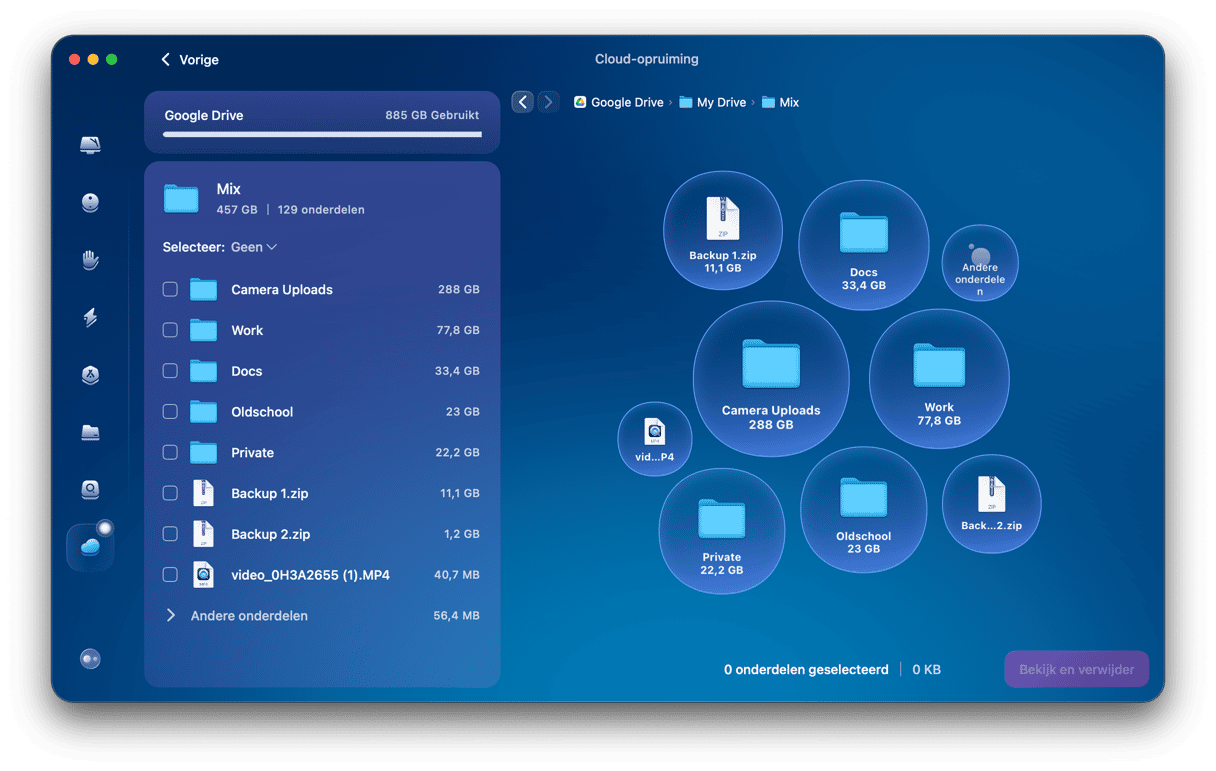 Om nog een stap verder te gaan, kun je ook de tool 'Cloud-opruiming' van CleanMyMac eens uitproberen. Deze tool maakt verbinding met je cloudaccounts en geeft je een duidelijk visueel overzicht van je opgeslagen bestanden. Je ziet zo in één oogopslag welke bestanden lokaal worden gesynchroniseerd en welke alleen in de cloud, zodat je slimmere opslagbeslissingen kunt nemen.Hieronder lees je hoe dit werkt, stap voor stap: