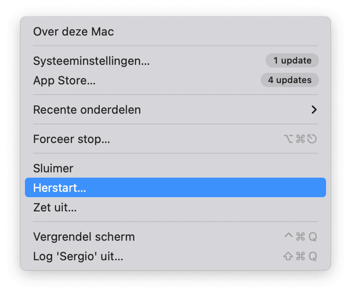 Je Mac opnieuw opstarten kan tijdelijke bestanden, gegevens in het cachegeheugen en systeemfouten verwijderen die van invloed kunnen zijn op de bureaubladsymbolen en de algehele prestaties. Om met een schone lei te beginnen, klik je op het Apple-menu en selecteer je 'Herstart'. Na het herstarten controleer je of het probleem is opgelost.