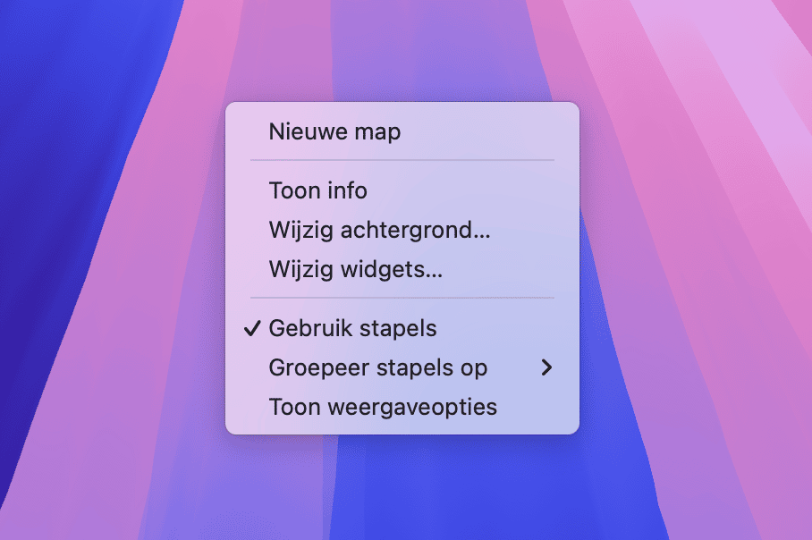 In macOS Ventura en later kun je onder Systeeminstellingen > Bureaublad en Dock aanpassen hoe onderdelen op je bureaublad worden weergegeven. Controleer onder Bureaublad en Stage Manager of 'Toon items' is ingesteld op 'Op bureaublad' in plaats van 'In Stage Manager'.